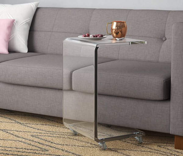 這款亞克力邊柜采用一塊優(yōu)質(zhì)的全透明亞克力材料熱彎而成,熱彎處光滑透亮,不變形不泛白沒氣泡。底部安裝四個滑輪,可移動方便實用,可以用在家里的每個角落。