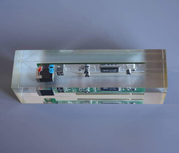這款水晶膠制品里面內(nèi)嵌一塊電路板,這樣不僅更方便展示電路板,還能防止電路板長時間暴露在空氣里引起氧化、生銹等質(zhì)變,水晶膠本身透明度高光滑有質(zhì)感瞬間提高產(chǎn)品檔次,而且水晶膠使用3-5年不變黃,可以說是一款充滿智慧的產(chǎn)品。