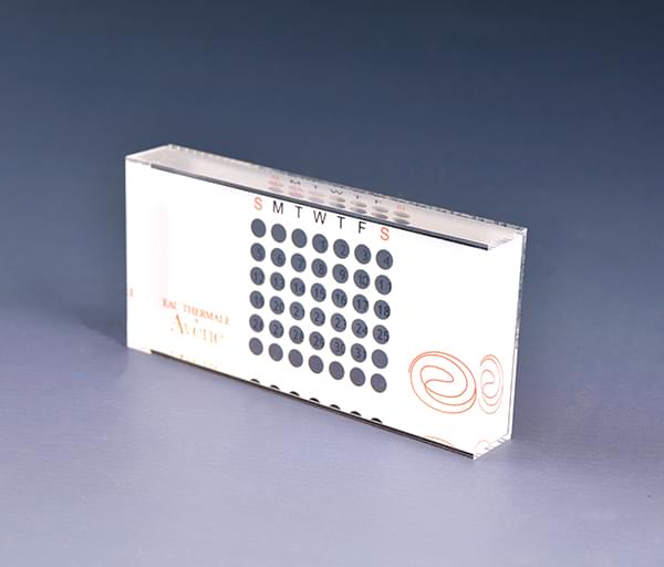 亞克力臺(tái)歷,國(guó)外客戶定制的一款亞克力臺(tái)歷,產(chǎn)品由兩部分組成,透明的薄外框中間印1-31的數(shù)字,內(nèi)嵌一塊厚的亞克力,厚的亞克力背面印白底與logo,兩塊亞克力橫向移動(dòng)即可切換不同的日期.