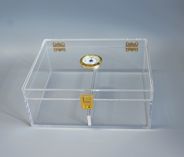 這款亞克力雪茄盒是我們幫客人打版定制的,采用3mm優(yōu)質(zhì)全新透明料,通過切割、雕刻、粘接、拋光等工藝制作而成,搭配金屬合頁、鎖扣、濕度計,防塵防潮,整體簡約大方,全透明盒身使里面的雪茄一目了然,外層安裝濕度計,隨時觀察。