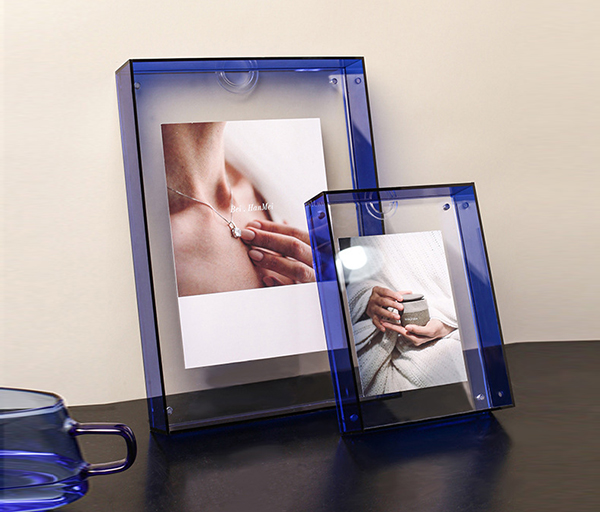 這款亞克力相框采用優(yōu)質(zhì)透明亞克力加透藍(lán)色亞克力板制作而成,顏值與功能聚集,選用材料耐候性好,保證多年不變色,手工拼接,牢固耐用,相片夾層與相框安置小磁鐵,不易脫落,方便安裝。